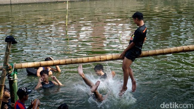 Dari pantauan detikJatim, lomba yang dimulai pukul 13.00 WIB itu dipenuhi sorak penonton. Para peserta beradu ketangkasan di atas sebilah kayu panjang sekitar empat meter yang dipasang melintang di atas sungai. Mereka saling memukul dengan bantal untuk menjatuhkan lawan agar tercebur.