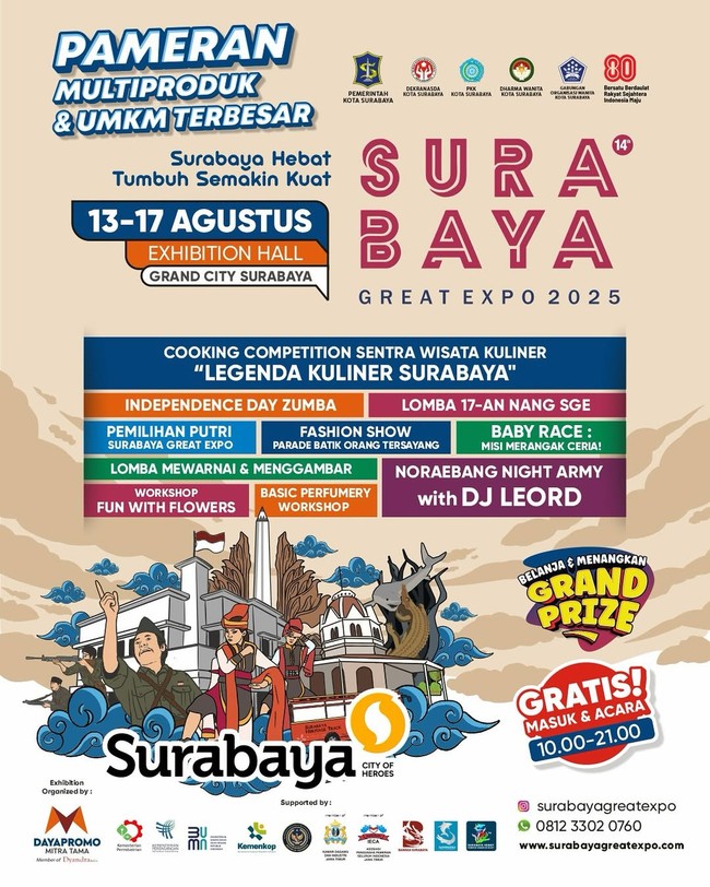 Rangkaian Surabaya Great Expo 2025 digelar meriah dengan mengusung tema "Surabaya Hebat Tumbuh Semakin Kuat". Ajang tahunan ini berlangsung pada 13-17 Agustus 2025 di Exhibition Hall Grand City Surabaya, dan dapat dinikmati masyarakat secara gratis mulai pukul 10.00 WIB hingga 21.00 WIB setiap harinya.