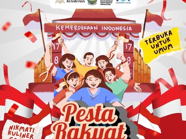 Dalam rangkaian peringatan HUT ke-80 Republik Indonesia, Pemprov Jatim menggelar sejumlah agenda termasuk pesta rakyat. Pesta rakyat akan menghadirkan hiburan musik serta kuliner gratis.
