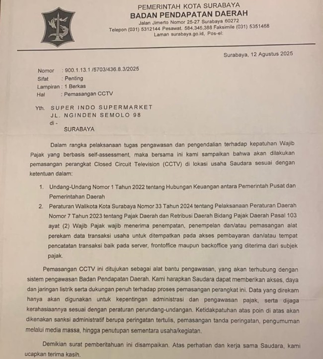 Surat dari Badan Pendapatan Daerah (Bapenda) Surabaya yang beredar di media sosial ramai diperbincangkan. Surat tersebut berisi permintaan agar restoran dan swalayan memasang CCTV di area pembayaran untuk memantau kepatuhan pajak.