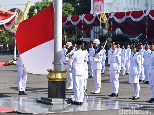 Upacara peringatan HUT ke-80 Kemerdekaan Republik Indonesia di Balai Kota Surabaya berlangsung khidmat pada Minggu (17/8/2025). Meski demikian, sempat terjadi insiden kecil ketika bendera merah putih terbuka dalam posisi terbalik sebelum dikibarkan.