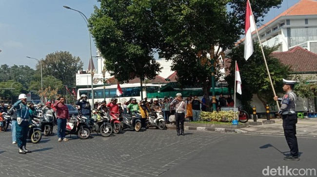 Nampak ratusan pengendara jalan yang berada di persimpangan Gereja Kayutangan (patung Chairil Anwar) itu memberi hormat mengarah kepada bendera merah putih yang dibawa oleh salah satu anggota Satlantas Polresta Malang Kota.
