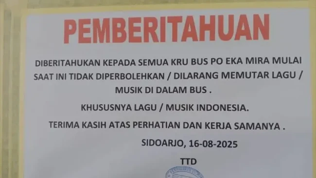 "Diberitahukan kepada semua kru bus PO Eka Mira mulai saat ini tidak diperbolehkan/dilarang memutar lagu/musik di dalam bus. khususnya lagu/musik Indonesia. Terima kasih atas perhatian dan kerja samanya. Sidoarjo, 16-08-2025. Ttd Operasional," demikian pemberitahuan PO Eka Mira yang ditulis dengan huruf kapital.