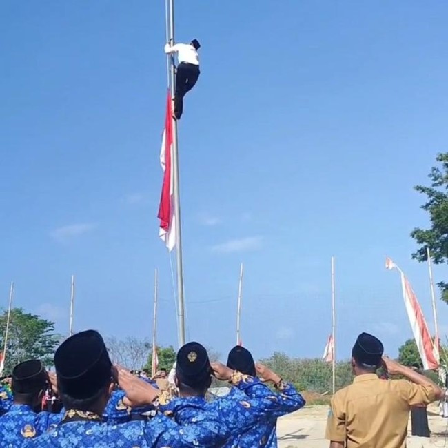 Dengan sigap, ia membetulkan tali sambil memastikan Merah Putih tetap berkibar sempurna di puncak tiang. Aksinya ini sempat terekam dan viral di media sosial.