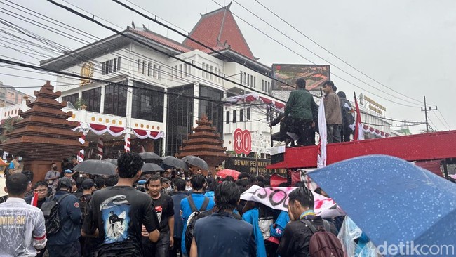 Pantauan detikJatim, massa aksi mulai berdatangan sejak pukul 14.00 WIB, kemudian sekitar pukul 15.00 WIB, hujan mulai mengguyur. Tetapi sebagian massa aksi tetap bertahan untuk menyampaikan tuntutannya hingga saat ini.