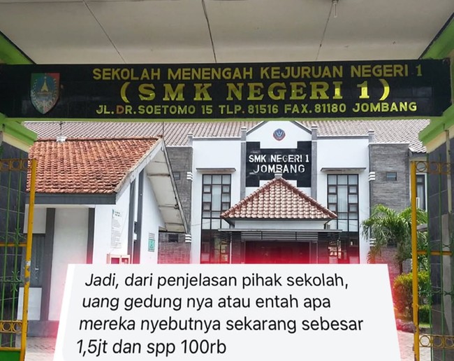 Sebuah foto tanda terima pungutan uang gedung Rp 1,5 juta per siswa SMKN 1 Jombang viral di media sosial. Postingan itu memicu polemik lantaran dianggap janggal dan menuai banyak komentar dari warganet.