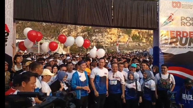 "Hari ini saya berbahagia bersama Mas Ibas, Pak Bupati Ponorogo, Pak Nyoman Hadi Ketua BPK, juga sesmenko perekonomian. Kita semua berkumpul bersama warga Ponorogo melakukan Merdeka Run," kata AHY usai berlari.