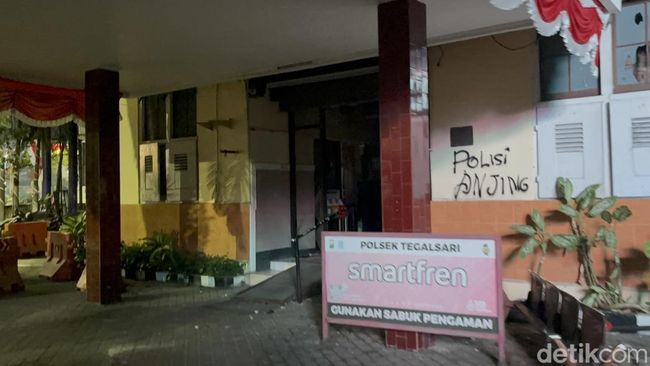 Nampak beberapa coretan di dinding yang dibuat massa aksi. Namun belum diketahui apakah terdapat barang-barang yang dirusak atau dijarah dari dalam Polsek Tegalsari.
