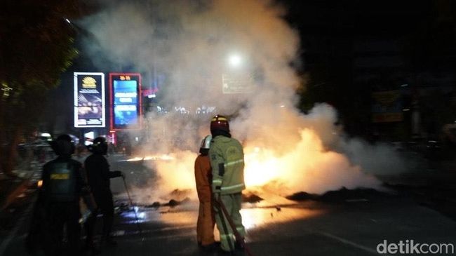 Petugas Dinas Pemadam Kebakaran dan Penyelamatan (DPKP) Surabaya ikut memadamkan api di kawasan Jalan Basuki Rahmat. Diketahui bahwa api itu timbul karena aksi massa yang masih bertahan hingga malam ini.