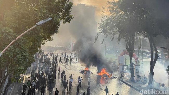 Demo yang digelar Jumat (29/8) di Grahadi berakhir rusuh hingga tengah malam. Massa yang melempar benda keras dibalas dengan semprotan meriam air dan gas air mata.