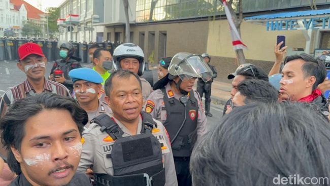 Kapolrestabes Surabaya Kombes Luthfie Sulistiawan menemui massa aksi mahasiswa usai dipukul mundur dari kawasan Polrestabes Surabaya di Jalan Sikatan. Luthfie menemui mahasiswa di Jalan Veteran dan sempat berbincang dengan mereka.