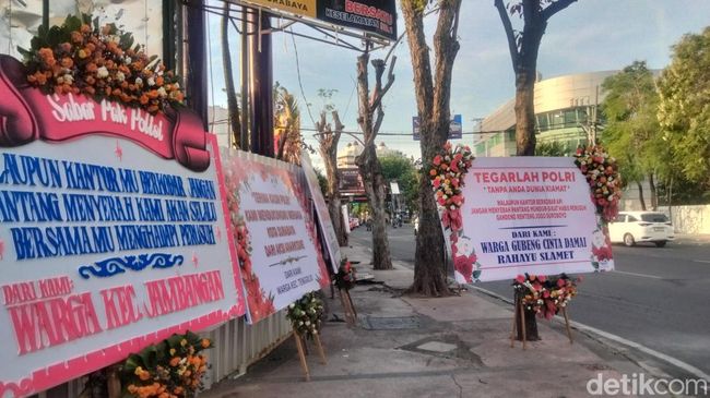 Dari pantauan detikJatim, karangan bunga dukungan untuk Polri tampak semakin banyak sejak pagi hari.