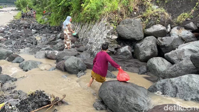 Warga harus ekstra hati-hati melompati bebatuan besar untuk menyeberangi sungai karena jembatan hancur usai diterjang banjir Lahar Semeru. Tak jarang, warga terpeleset saat menyeberangi bebatuan yang licin.