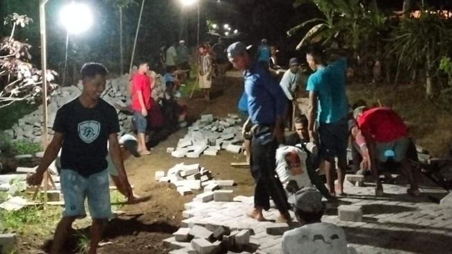 Pemandangan guyub itu terlihat saat warga melakukan pavingisasi jalan. Di bawah cahaya lampu, mereka kompak memasang balok paving satu per satu dengan penuh semangat.