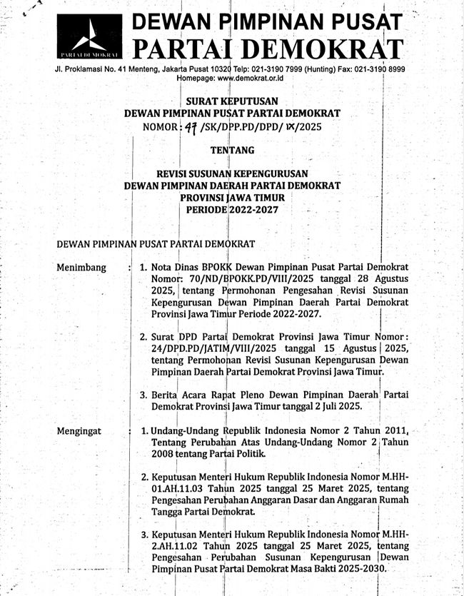 detikJatim menerima salinan nama-nama Pengurus Demokrat Jatim periode 2022-2027 dalam SK DPP Demokrat Nomor 47/SK/DPP/.PD/DPD/IX/2025 Tentang Revisi Susunan Kepengurusan DPD Partai Demokrat Jawa Timur. Dalam SK terbaru itu, nama Mugianto yang sebelumnya menjadi OKK Demokrat Jatim kini menjadi Plt Sekretaris Demokrat Jatim.