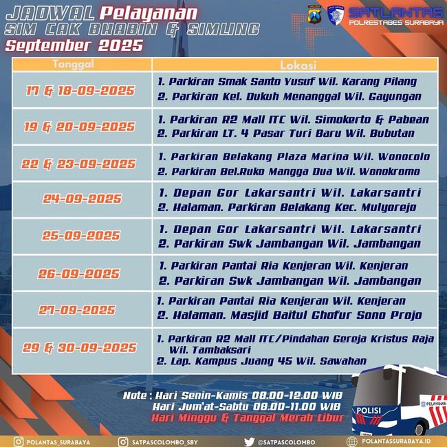 Dikutip dari Instagram resmi Unit Layanan SIM Satpas Satlantas Polrestabes Surabaya @satpascolombo_sby, berikut jadwal lengkap SIM Keliling periode 19-30 September 2025.