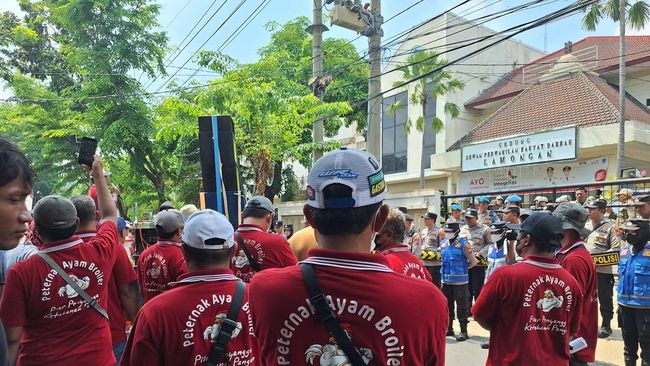Ratusan peternak ayam broiler di Lamongan yang tergabung dalam Perkumpulan Peternak Rakyat Pejuang FCR unjuk rasa di depan Gedung DPRD dan Mapolres Lamongan. Mereka menyuarakan keresahan peternak atas tindakan aparat penegak hukum (APH) yang sidak ke kandang tanpa surat tugas.
