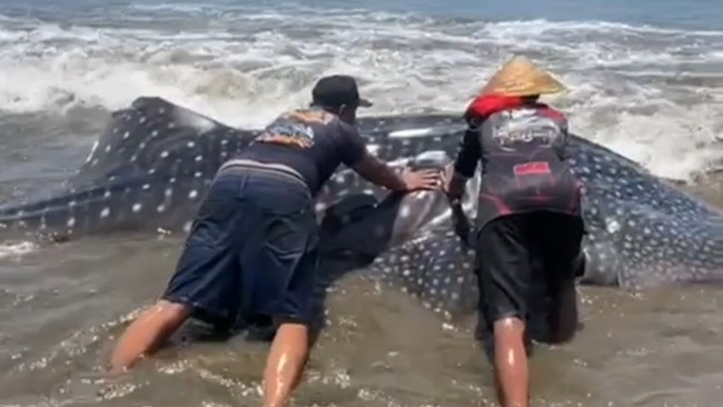 Pihaknya mengimbau masyarakat jika menemukan hiu paus yang terdampar agar memberikan pertolongan dengan didorong ke tengah laut.