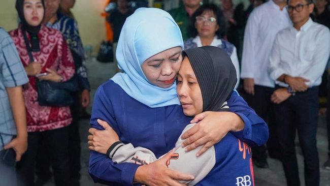 "Semua jenazah masih dalam proses identifikasi. Ibu makan ya, jangan sampai tidak makan. Kalau ibu sakit nanti malah tidak bisa menemani proses ini," ujar Khofifah sembari menggenggam dan memeluk erat Halimah.
