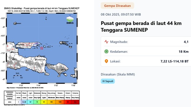Gempa bumi bermagnitudo (M) 4,1 mengguncang wilayah Kabupaten Sumenep, Rabu (8/10/2025) pagi. Getaran gempa dirasakan warga di Pulau Sapudi.