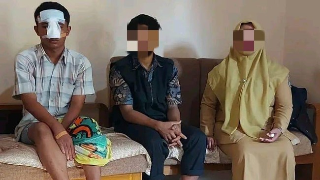 Postingan di media sosial Facebook, tampak seorang siswa laki-laki mengalami luka pada bagian hidung dengan balutan perban. Di sampingnya, ada anak laki-laki dan seorang guru.