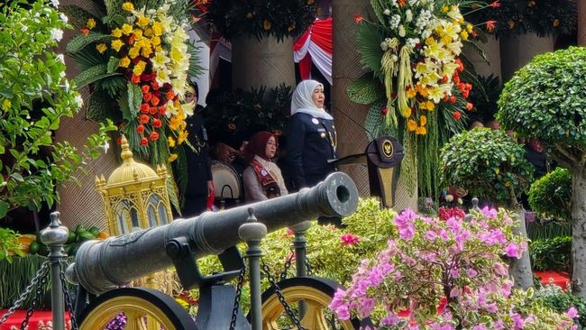"Delapan puluh tahun Provinsi Jawa Timur menjadi perjalanan panjang penuh sejarah, perjuangan, sekaligus kemajuan," ujar Khofifah dalam pidatonya saat memimpin Upacara Peringatan Hari Jadi ke-80 Provinsi Jawa Timur di Gedung Negara Grahadi Surabaya, Minggu (12/10/2025).
