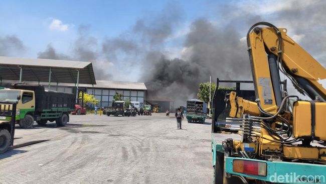 Gudang perbaikan kendaraan milik PT Merak Jaya Beton di Jalan Arteri Porong, Sidoarjo, terbakar hebat pada Senin (13/10/2025) pagi.