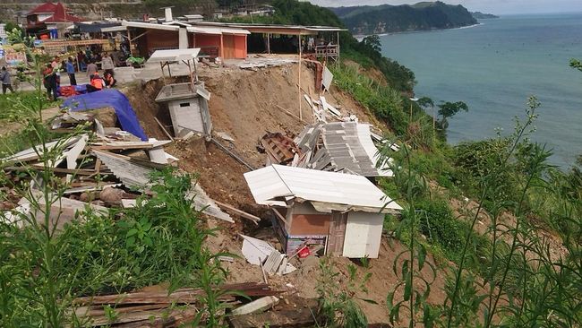 Benar saja, Minggu pagi sekitar pukul 8.00 WIB terjadi longsor besar. Lereng sepanjang 70 meter tiba-tiba ambrol dan menyeret dua warung yang berdiri di atasnya.