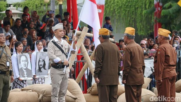 Dari pantauan detikJatim, teatrikal dimulai pukul 14.19 WIB. Pertunjukan pertama diperankan oleh perempuan-perempuan Surabaya yang turut memperjuangkan kemerdekaan.