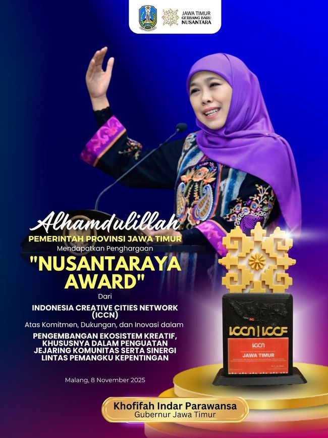 "Alhamdulillah Jatim berhasil meraih penghargaan Nusantaraya Award dari ICCN. Salah satu alasan kuat adalah karena Jatim memiliki komitmen, dukungan dan inovasi dalam pengembangan ekosistem kreatif, khususnya dalam penguatan jejaring dan sinergi lintas pemangku kepentingan," ujar Khofifah saat di Gedung Negara Grahadi Surabaya, Minggu (9/11/2025).