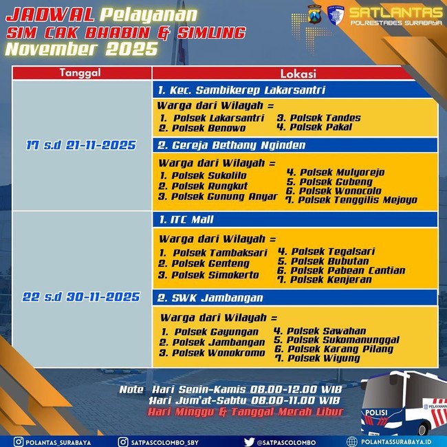 Dikutip dari Instagram resmi Unit Layanan SIM Satpas Satlantas Polrestabes Surabaya @satpascolombo_sby, berikut jadwal lengkap SIM Keliling periode 18-30 November 2025.