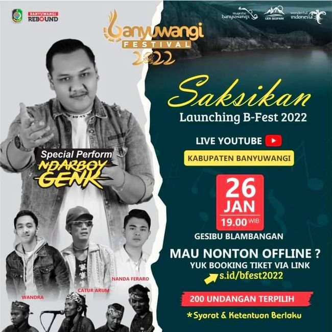 Ajang atraksi pariwisata Banyuwangi Festival (B-Fest) 2022 akan segera digeber. Dalam launching 99 event tersebut, Pemkab Banyuwangi bakal mengundang Ndarboy Genk, musisi yang sedang naik daun dengan lagu-lagu Jawa kekinian.
