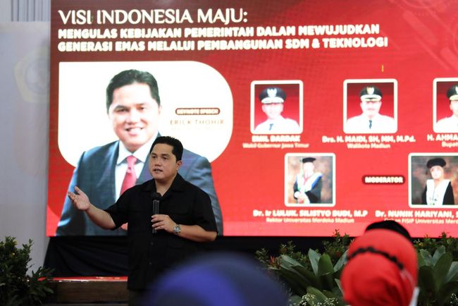 Menteri BUMN Erick Thohir mengisi seminar di Universitas Merdeka Madiun, MInggu (6/2/2022). Erick menjawab sejumlah pertanyaan dari mahasiswa soal skandal korupsi hingga peningkatan signifikan laba perusahaan BUMN.