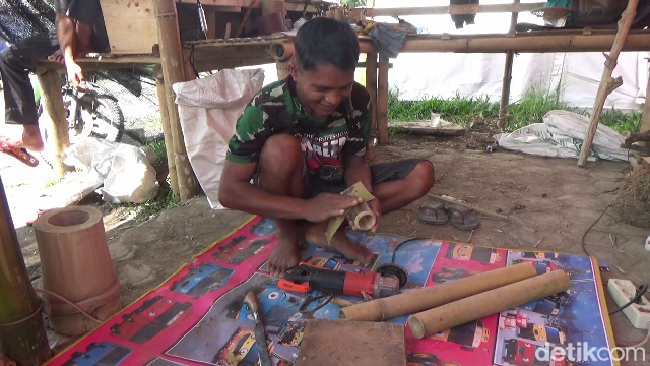 "Awalnya saya kerja di tambang pasir, karena terjadi erupsi saya mengungsi sehingga tidak ada kerjaan. Karena di sini banyak bambu sehingga saya membuat aneka kerajinan bambu," ujar Sahlan kepada detikJatim, Kamis (28/4/2022).