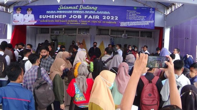 Ribuan pencari kerja serbu Gedung Korpri Jalan Dr Cipto Sumenep. Mereka berjubel mencari informasi pekerjaan di Job Fair yang disediakan 21 perusahaan dan 4 instansi pemerintah. Job fair digelar selama 2 hari mulai hari ini, Rabu-Kamis (16-17/11/2022).