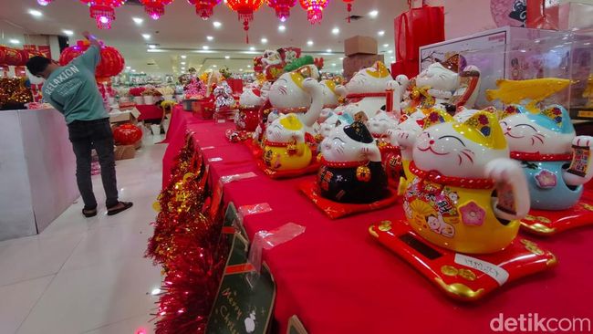 Pantauan detikJatim, toko pernak pernik atau ornamen Imlek di Pasar Atom Surabaya mulai semarak. Banyak serba-serbi kelinci yang dipajang.