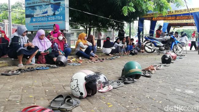 Pantauan detikJatim di lokasi sekitar pukul 11.00 WIB, ratusan warga duduk berjajar di sebelah garis dari tali rafia yang disiapkan untuk antre. Sebagian lagi duduk bergerombol berteduh di bawah pohon.