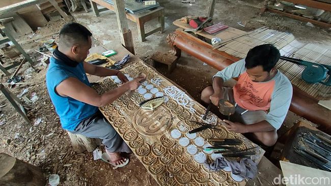 Di ruang workshopnya, Sutrisno (47) bersama para karyawan terlihat sibuk memahat lembaran papan kayu jati yang sudah digambar terlebih dahulu. Mereka serius memahat dengan teliti.