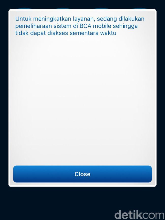 Pantauan detikJatim, dini hari tadi ada saat membuka M-Banking BCA ada pesan yang menyebutkan bahwa aplikasi sedang dalam perawatan atau maintenance