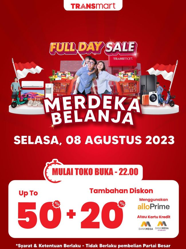 Dalam rangka program Merdeka Belanja, Transmart Full Day Sale hadir lagi besok, Selasa, 8 Agustus 2023. Diskonnya 50% + 20% lho, borong yuk!