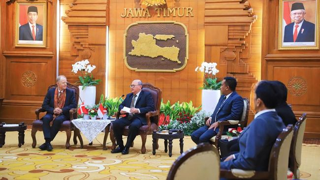 Penjabat (Pj) Sekdaprov Jatim Bobby Soemiarsono menerima Duta Besar (Dubes) Denmark untuk Indonesia, Sten Frimodt Nielsen di Gedung Negara Grahadi Surabaya. Sejumlah kerja sama dijajaki oleh kedua belah pihak.