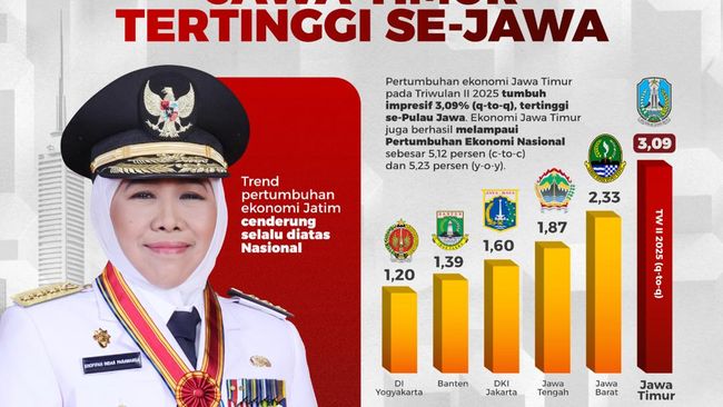 "Alhamdulillah di kuartal kedua ini pertumbuhan ekonomi Jatim tertinggi se-Jawa, dan melampaui pertumbuhan ekonomi nasional, kita perlu syukuri capaian ini," ujar Gubernur Jatim Khofifah Indar Parawansa di Gedung Negara Grahadi Surabaya, Rabu (6/8/2025).