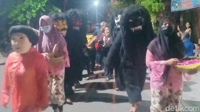 "Deretan wanita di belakang kakek, baru di belakangnya kostum genderuwo. Serta paling terakhir iringan gamelan ada gong kemudian alat klotelan atau kentongan dari bambu juga ada," tutur Walgito.