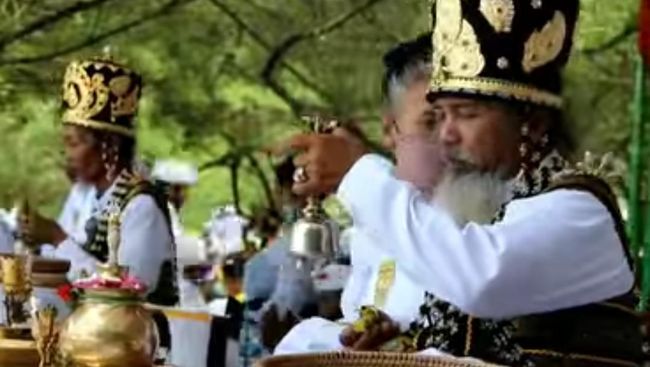 Upacara melasti digelar terbatas di Pantai Jolosutro Kecamatan Wates, Blitar. Upacara berjalan khidmat, meski penjagaan ketat dilakukan selama acara.