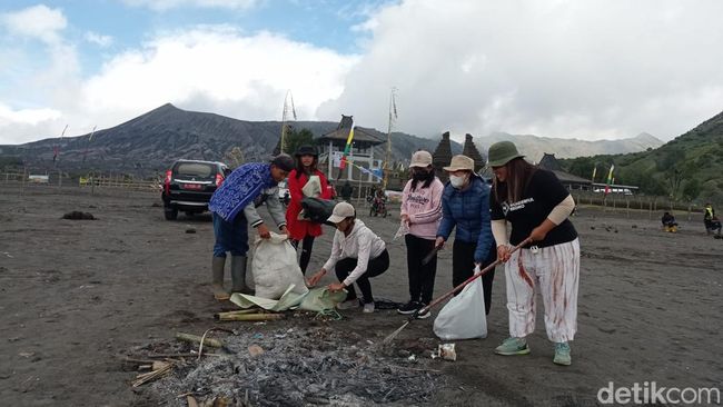 Ada aksi bersih-bersih sampah di lautan pasir Gunung Bromo usai Yadnya Kasada 2022. Mereka yakni warga Tengger bersama Forum Sahabat Gunung.