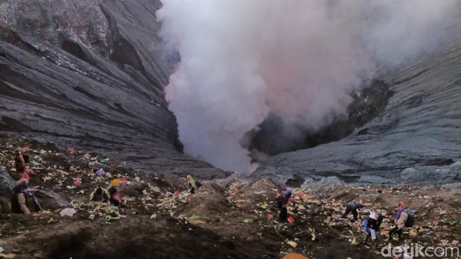 Sampai di bibir kawah, warga Tengger dan para dukun langsung melempar sesaji ke dalam kawah. Yang dilempar biasanya hasil bumi hingga hewan ternak.