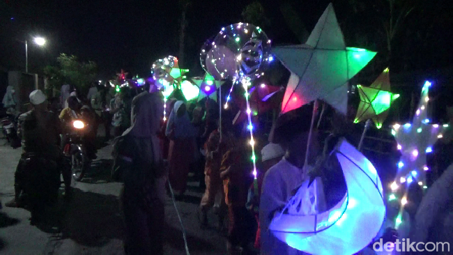 Para santri dengan antusias berkeliling Jalan Desa Darungan dengan membawa lampion beraneka bentuk dan warna sambil membaca selawat nabi.