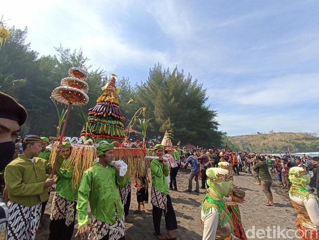 Tradisi larung sesaji di Pantai Serang digelar pada Minggu (31/7/2022). Tradisi larung sesaji tidak hanya sebagai upaya untuk nguri-uri budaya, tapi juga sebagai peningkatan pariwisata dan ekonomi Kabupaten Blitar.