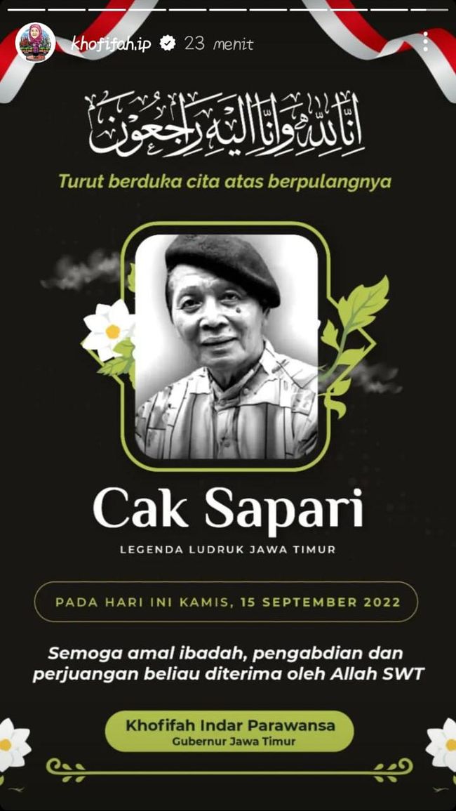 "Turut berduka cita atas berpulangnya Cak Sapari, legenda ludruk Jawa Timur," kata Khofifah dalam unggahan di Instagram Story-nya @khofifah.ip yang dilihat detikJatim, Kamis (15/9/2022).