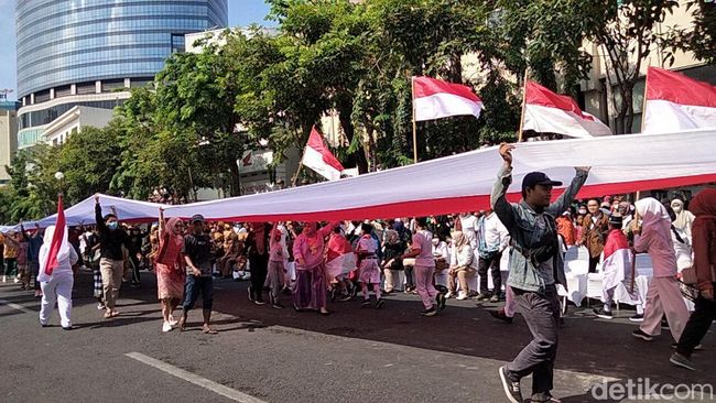 Dari pantauan detikJatim, ada ribuan peserta yang terlibat di dalamnya. Mereka tampak mengusung bendera sepanjang 800 meter yang dibentangkan di sepanjang Jalan Tunjungan.